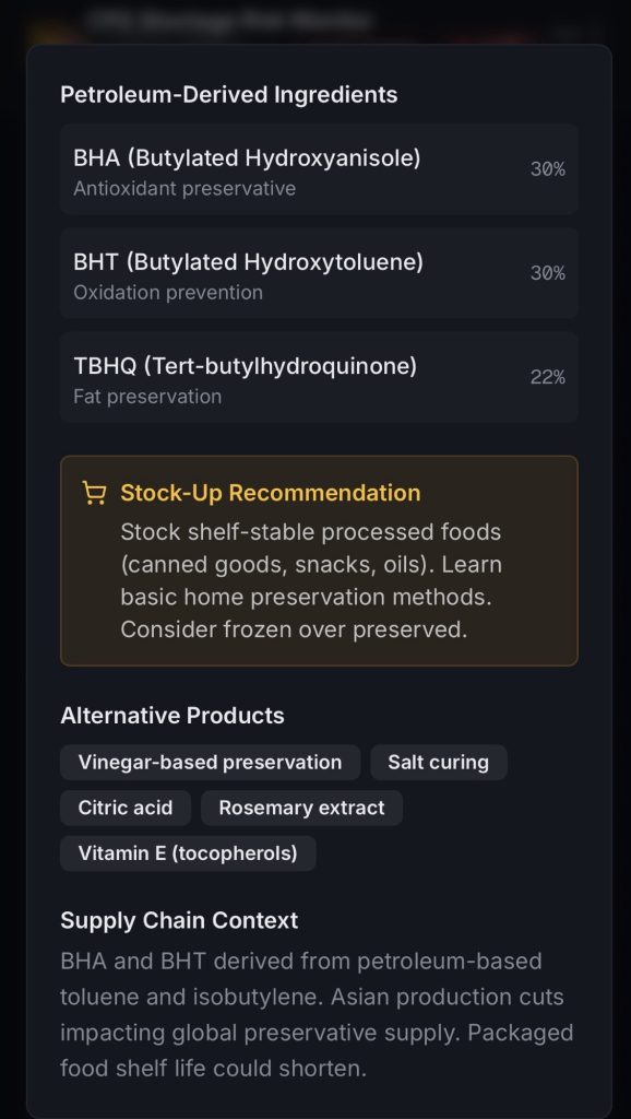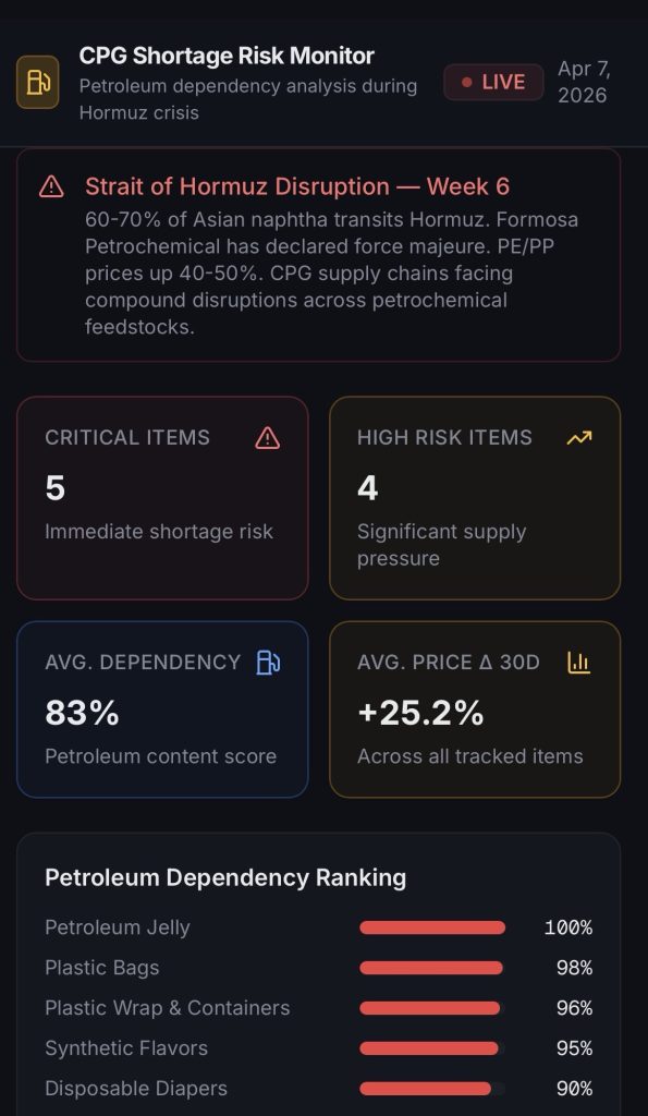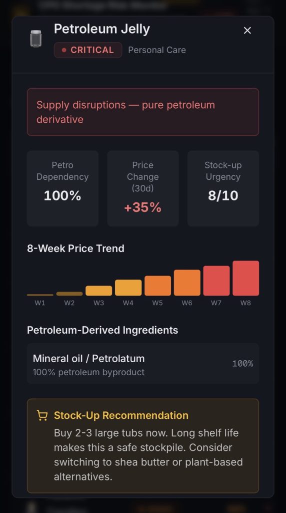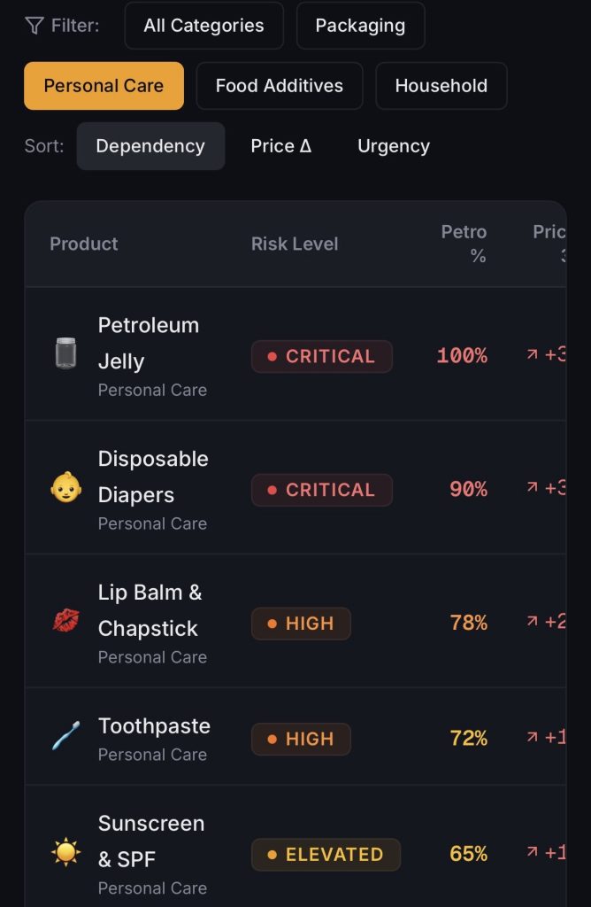 I vibe coded a dashboard of common household items with petroleum byproducts in them. It analyzes ingredients and wholesale pricing and assigns risk scores so you can make a shopping list of items most impacted by the ongoing supply chain crisis.